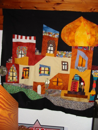 - Kurs bei Bernadette Mayr “Ein Haus nach Hundertwasser” in freier Verschneidetechnik. Das gefällt mir: Es geht schnell ohne lange Vorbereitungen und - wie einfach können Rundungen sein. Das Top entwickelt ein Eigenleben und wächst ungewollt etwas überdimensional. Bis heute (2006) fehlen nur noch die Bäume, aber noch ist es ein UFO.